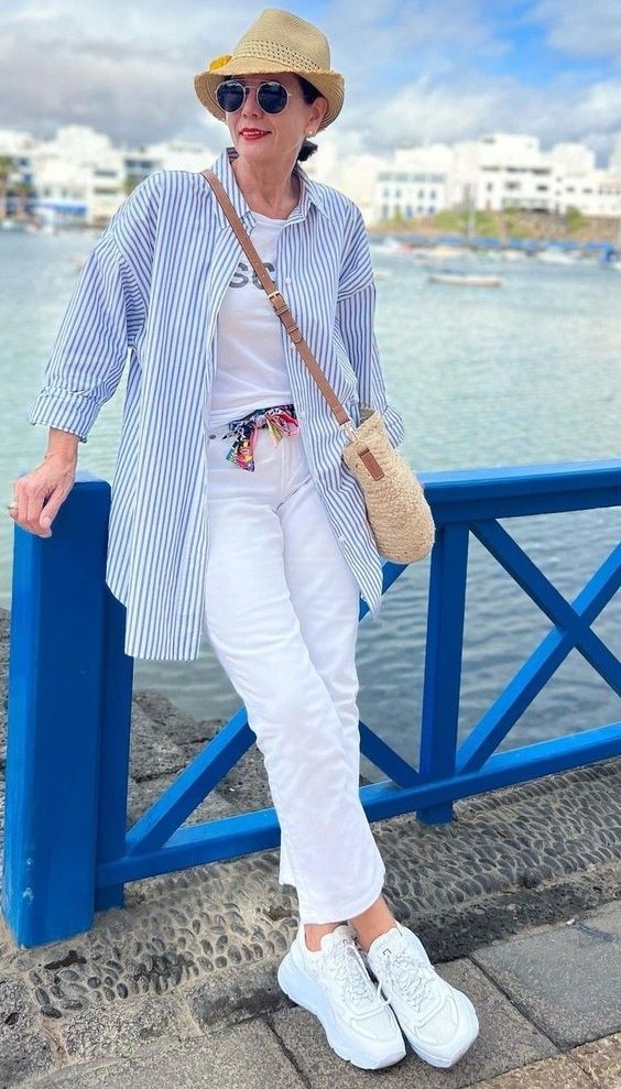 This look is the essence of a breezy summer day by the water. A crisp white shirt layered over a playful, tied waist accentuates white pants, creating an airy, nautical vibe. Accessorized with a straw hat and a crossbody bag, it’s a harmonious blend for the 60 or 50 European woman who appreciates style that moves seamlessly from a seaside stroll to a casual lunch. The white sneakers add a modern touch to this classic look, perfect for vacation resort wear.