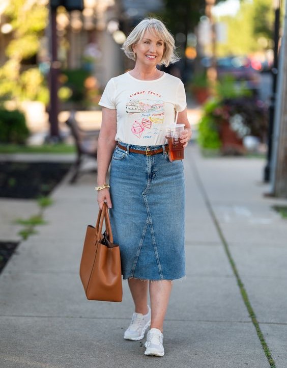 Graphic tees add a playful edge to any summer capsule, and when paired with a denim midi skirt, it creates an ensemble with attitude. This outfit is a cheerful nod to casual street styles, ideal for a birthday brunch or a day out with friends. The leather tote and white sneakers are the perfect accessories for a young professional with a love for 2024 fashion trends.