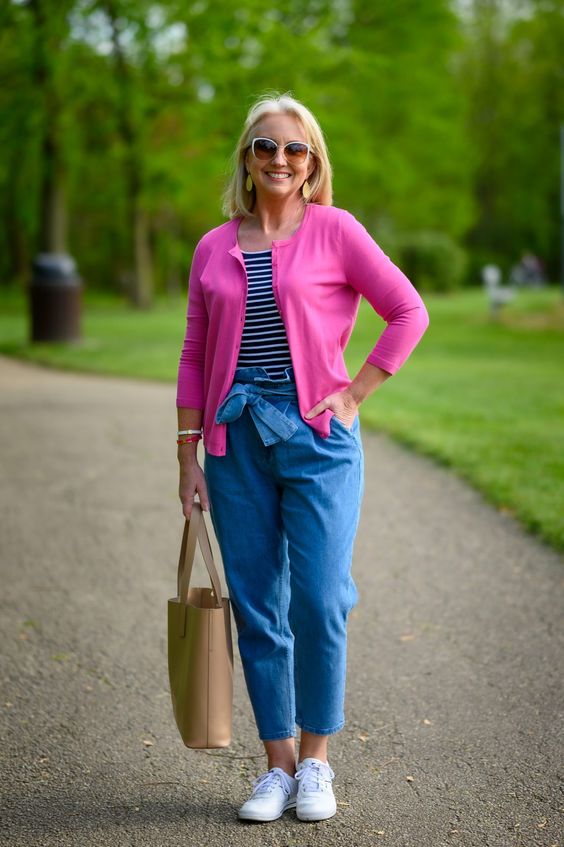 A pop of pink adds a playful element to this casual look. A pink cardigan over a striped top, paired with denim pants, strikes the perfect balance between comfort and style. The white sneakers add a trendy touch, making this outfit suited for a casual walk in the park or a relaxed weekend outing.