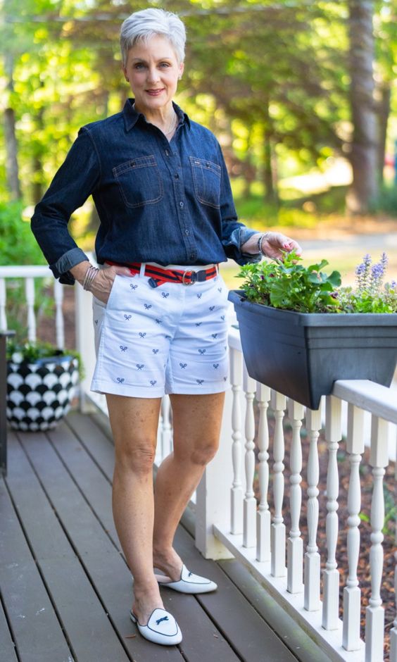 Embracing the nautical trend, this outfit presents a playful yet sophisticated take on summer outfits for older women. The denim shirt, worn with rolled-up sleeves, pairs beautifully with white shorts adorned with anchor motifs. A bold red belt punctuates the ensemble, echoing the adventurous spirit of maritime travel. This outfit is ideal for an afternoon of camping by the lakeside or pottering around in the garden, marrying functionality with a zest for life.