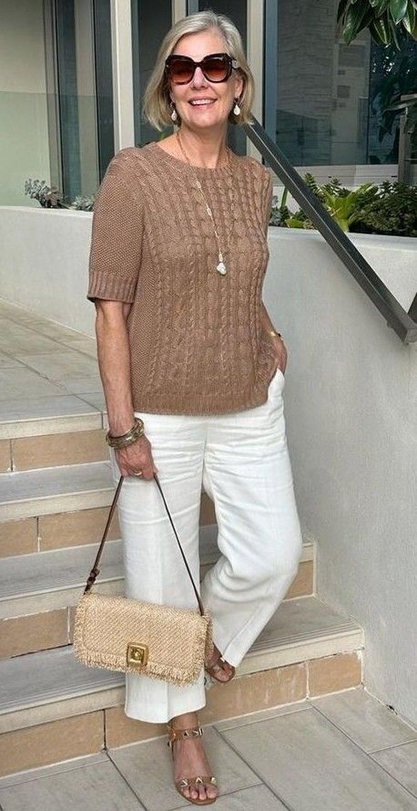 The harmony of natural hues comes alive in this outfit, which is a nod to both the essentials for a mature wardrobe and the fashion trends of 2024. A textured brown sweater is paired with flowing white linen trousers, creating a balance between structure and fluidity. The ensemble is accessorized with a long pendant necklace and a chic straw bag, embodying the relaxed sophistication of vacation resort wear. It’s a look that resonates with the refined tastes of the 40-something crowd, yet would not be out of place on a stylish woman in her 30s.