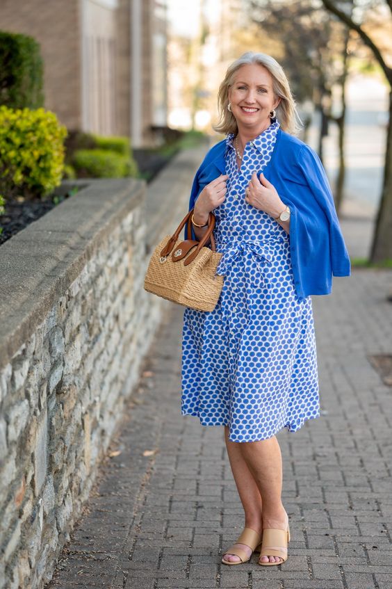 Here we have a vision in blue that captures the vibrant spirit of summer. A bold, blue and white patterned dress is beautifully accented with a cobalt blue jacket, creating a look that is both striking and sophisticated. Paired with a woven handbag and neutral sandals, this outfit is perfect for those birthday celebrations or as vacation resort wear. It’s a testament to how European fashion sensibilities can be infused with personal flair to create a look that’s both festive and elegant.