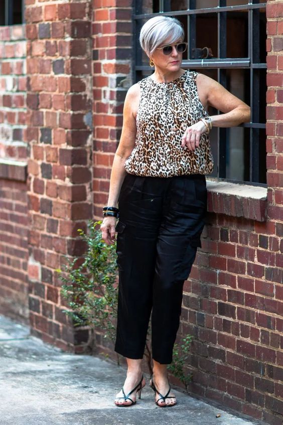 This outfit exudes a bold confidence with its safari-inspired palette and patterns. A leopard print tank top pairs elegantly with black capri pants, creating a look that’s both trendy and timeless. Accessorized with black heeled sandals and statement jewelry, this ensemble is suited for the urban jungle. It’s a perfect choice for a young professional with a penchant for casual street styles that make a statement.