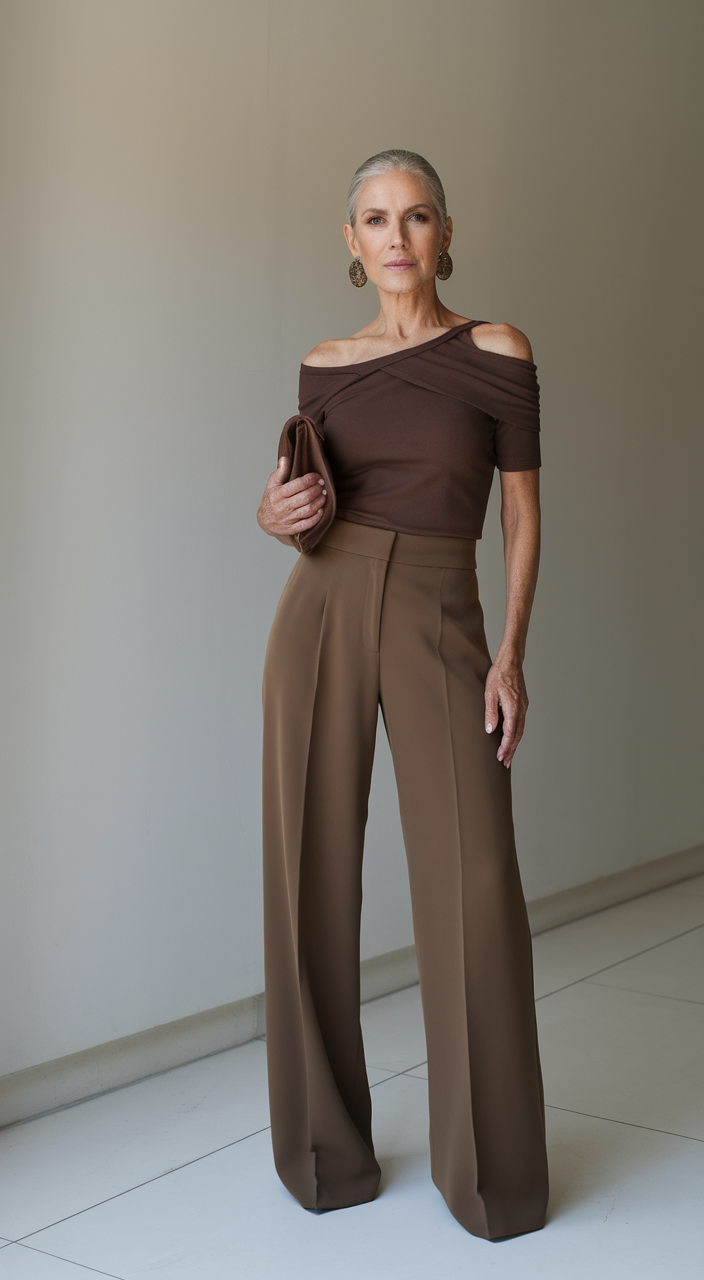 This combination pairs a fitted, chocolate brown off-the-shoulder top with earthy, high-waisted, wide-leg pants. The combination of the trousers’ elegant lines and soft draping creates a contemporary, stylish outfit that can be worn from day to evening. Such outfits are an excellent choice when you want to keep your casual looks sophisticated and elegant. Ideal for dressy casual events or a stylish lunch date.
