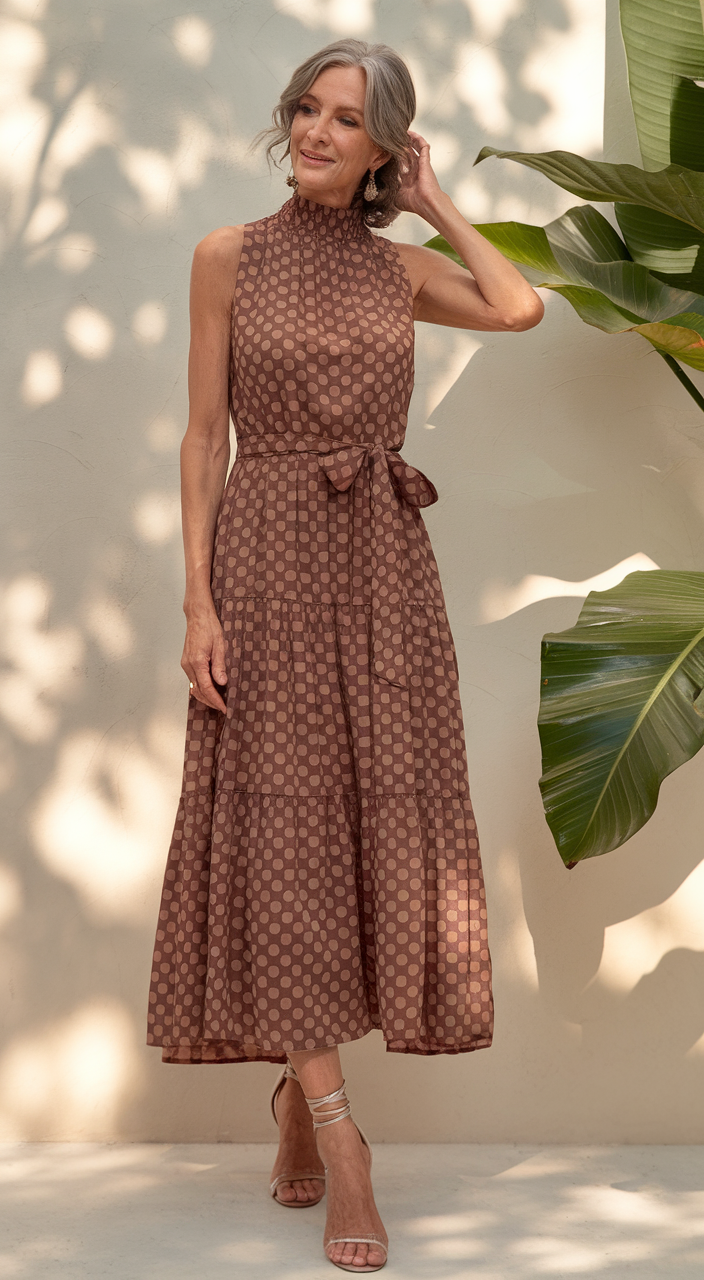 The brown-based sleeveless midi dress features delicate polka dots along with its layered skirt. This casual look features a gathered neckline and tie waist that defines the silhouette without losing its relaxed shape. The wind-resistant design stays cool in the Florida heat so you can enjoy both sunny and twilight strolls. A great choice for cute and confident style fifty not frumpy dressing.