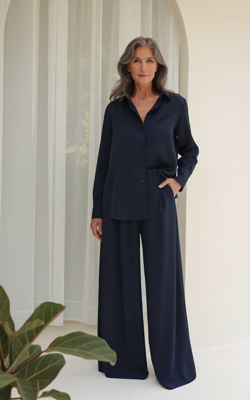 A monochromatic look is achieved by combining a navy silk button-up shirt with navy wide leg pants. Practical yet sophisticated relaxation in tailoring is right in line with the preferences of today’s woman who wants to be elegant yet comfortable in her wardrobe. In any future outfit collection, this ensemble effortlessly matches what will be en vogue in 2025. This stylish outfit provides stylish casual fashion with reduced work requirements.