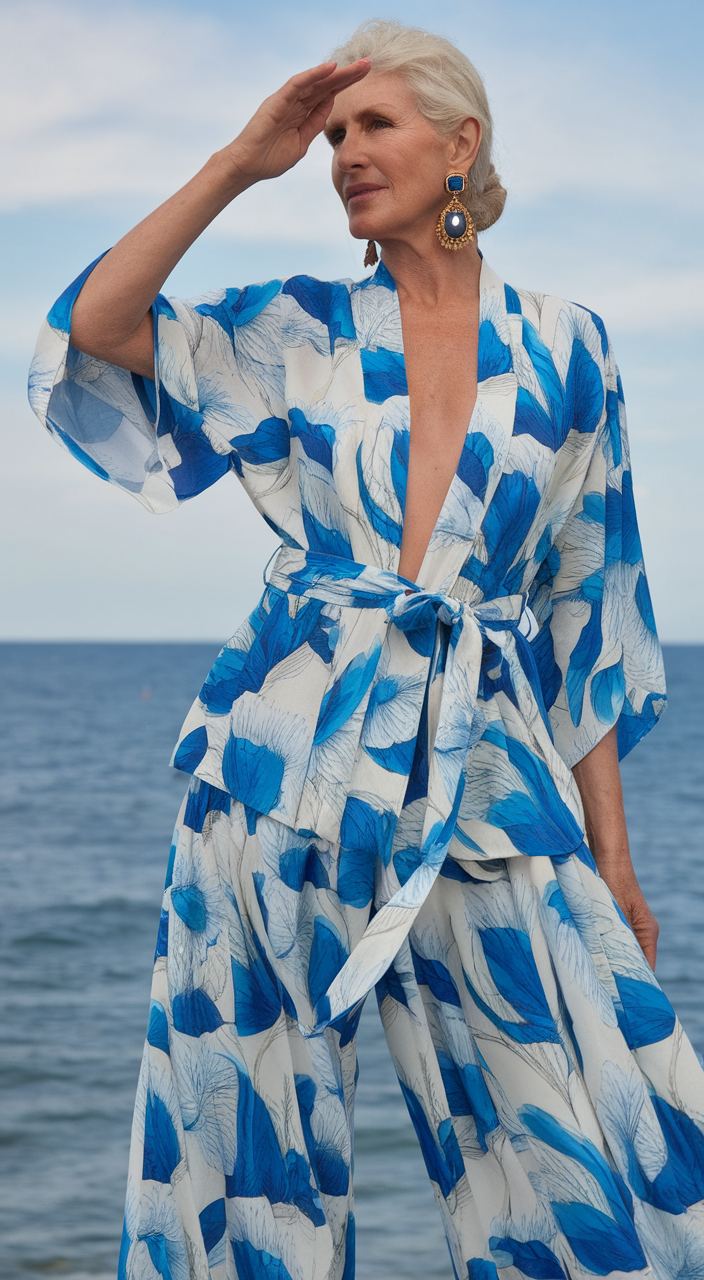 The package consists of a kimono-cut top combined with wide-leg pants in a flowing fabric with blue and white petal patterns. Your silhouette is accentuated by the cinched waist, while the wrap top is tied in place to maintain a relaxed and airy look. The perfect combination of bohemian elegance and relaxed style, this outfit is perfect for Florida vacations and beach nights. A standout among summer outfits for women over 50 – 2025.