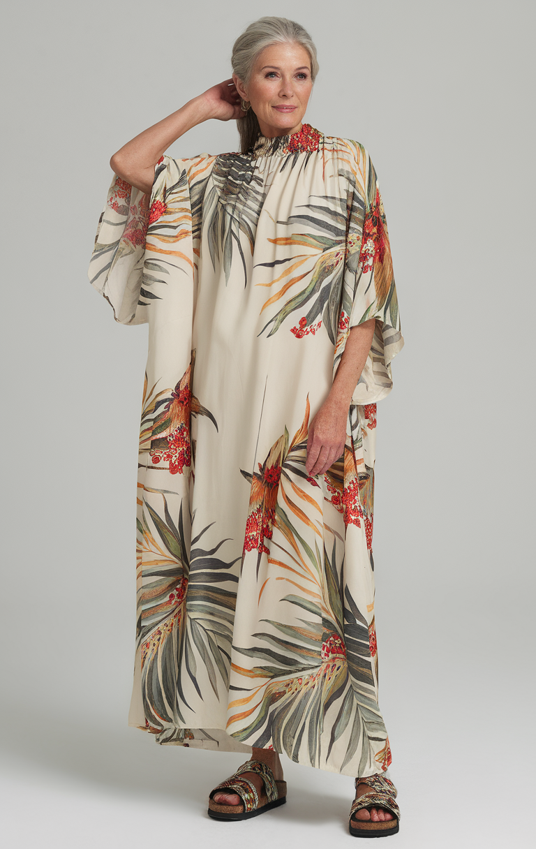 This loose-fitting maxi caftan features an eye-catching tropical print in earthy reds, greens and yellows on a light background. The design of the dress, with its high neckline and oversized sleeves, creates an unpretentious, casual look that adds a modern twist to the ensemble. The outfit works well as a comfortable beach resort outfit as well as a fashionable piece that adds volume to summer fashion. A natural fit for classic casual in 2025.