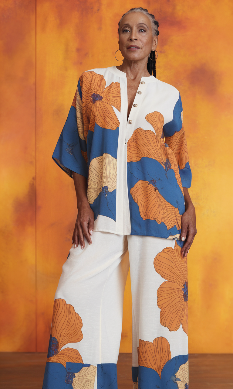 Wonderfully playful summer vibes come from pairing oversized floral patterns that feature vibrant orange and deep blue in a two-piece set. The outfit consists of wide-legged pants and a loose button-up top that will make you feel comfortable while looking stylish and chic. The mix combines traditional preppy block color design with contemporary woman dressing. Use this ensemble to achieve a powerful, stylish look without any effort.