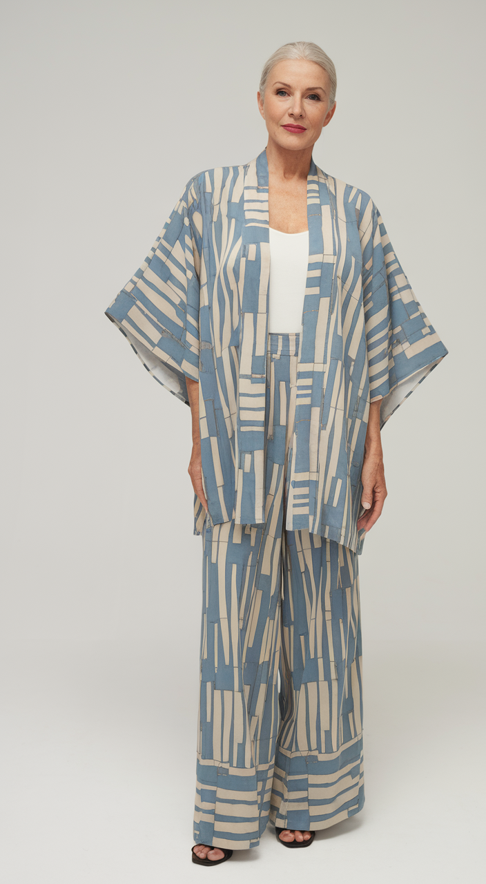 This two-piece set consists of a kimono-style jacket and wide-legged pants featuring modern geometric patterns in a blue and beige color palette. The outfit finds stability through its white tank base, which creates both dress and leisure while maintaining an elegant appearance. Minimalist fashion aficionados will appreciate this outfit as it offers trendy elegance without compromising comfort. A refreshing classic casual option for the modern woman.