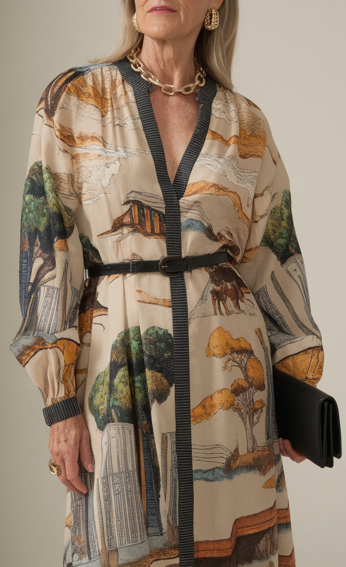 This dress features a stunning print of scenic natural imagery that spreads across the neutral colored base with a waist belt. This item ends with a slim black belt along with a defined neckline to create a sophisticated artistic look. The outfit creates an elegant, sophisticated look that achieves style without excessive embellishment. A perfect choice for elegant casual dinners or gallery strolls in 2025.