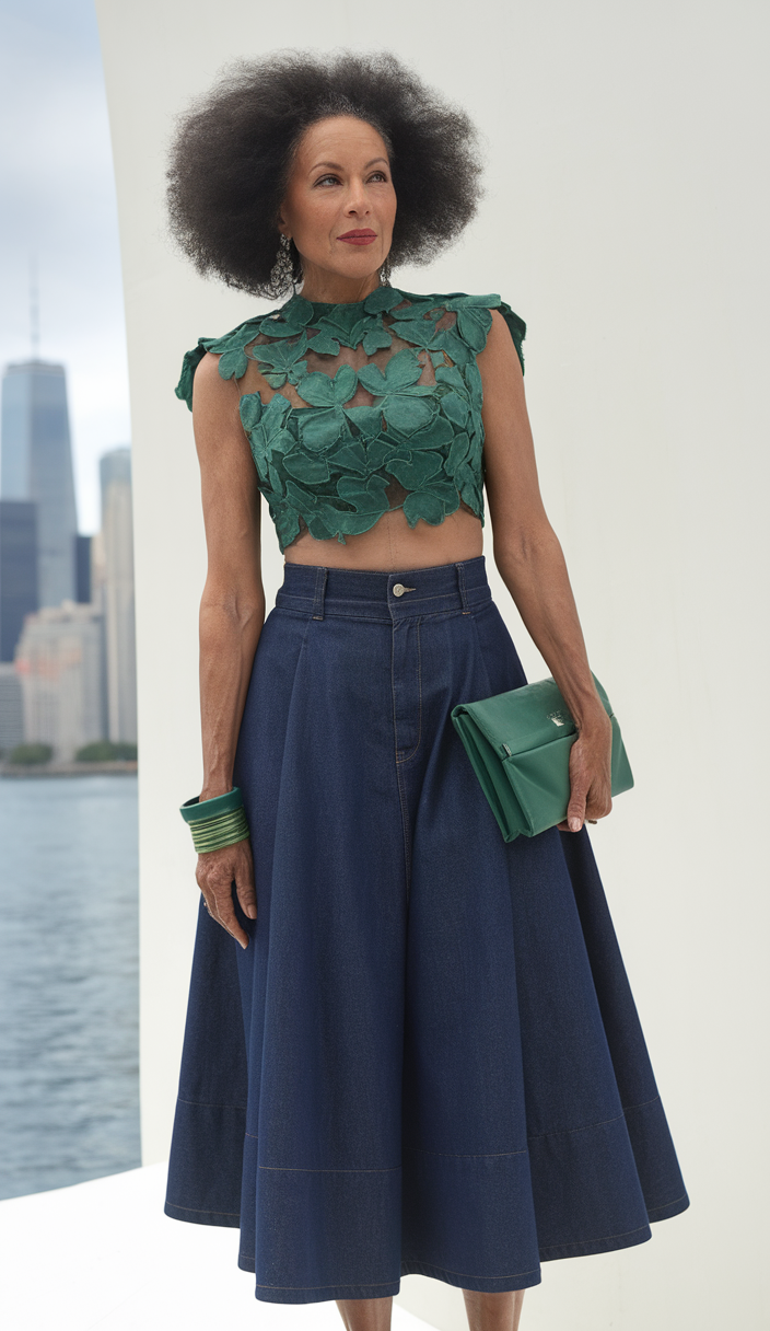 A green leaf appliqué crop top is paired with a high-waisted dark denim flared skirt that hits mid-calf. The intricate texture of this top gives a contemporary look to traditional skirt cuts. The outfit creates a strong yet sophisticated summer look. The confident modern woman will find the perfect outfit choice in this fashion style.