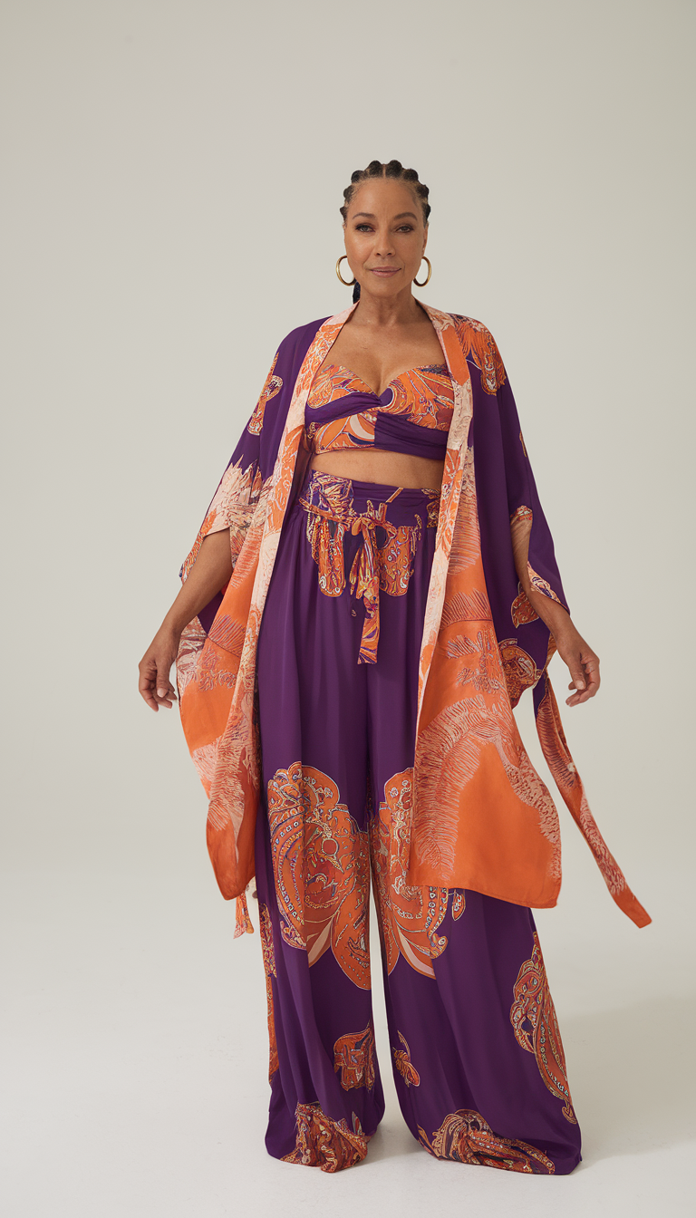 A vibrant two-piece set with a matching kimono in rich purple and fiery orange makes a trendy, boho statement. The flowing design of the pants combined with the bold patterns create a Nashville-inspired appeal that is also perfect for Florida’s warmer days. A person wearing this style chooses elegant and preppy clothing to create refreshingly casual looks. The size and fit feel effortless yet intentional, bringing together sweet and confident energy.
