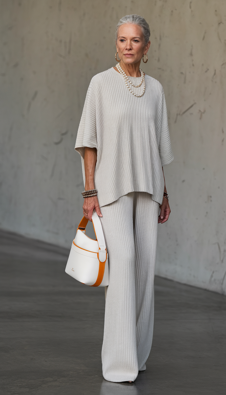 This outfit includes an oversized ribbed knit top paired with wide-legged oatmeal pants in the same fabric. The depth of this outfit comes from its texture, which allows for a casual yet classic relaxed style that is just right for road trips or daytime activities and meals. This casual design offers three great qualities: cuteness, comfort and stylish modernity. This ensemble offers modern style rather than frumpiness to give the best possible representation of fashion for women over 50.