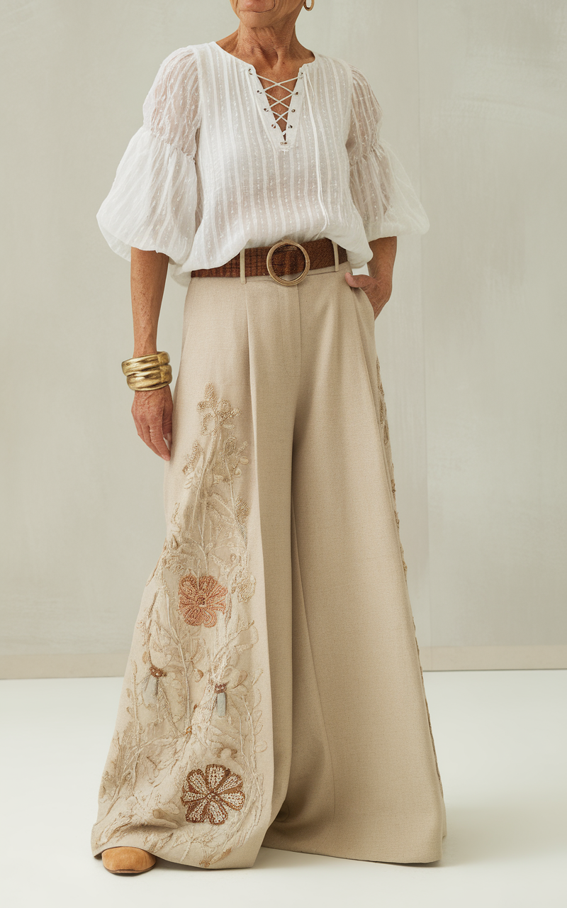 A lightweight white peasant blouse with lace-up details is paired with a high-waisted, wide-legged beige pant with floral embroidery at the bottom. The design of the wide-leg opening and waist-hugging style creates an established, effortless look that remains visually appealing while remaining comfortable. This outfit style offers preppy elements for everyday wear with attractive textures that add elegance. These clothes present an artful approach to showcasing 2025 fashion style while maintaining comfort.