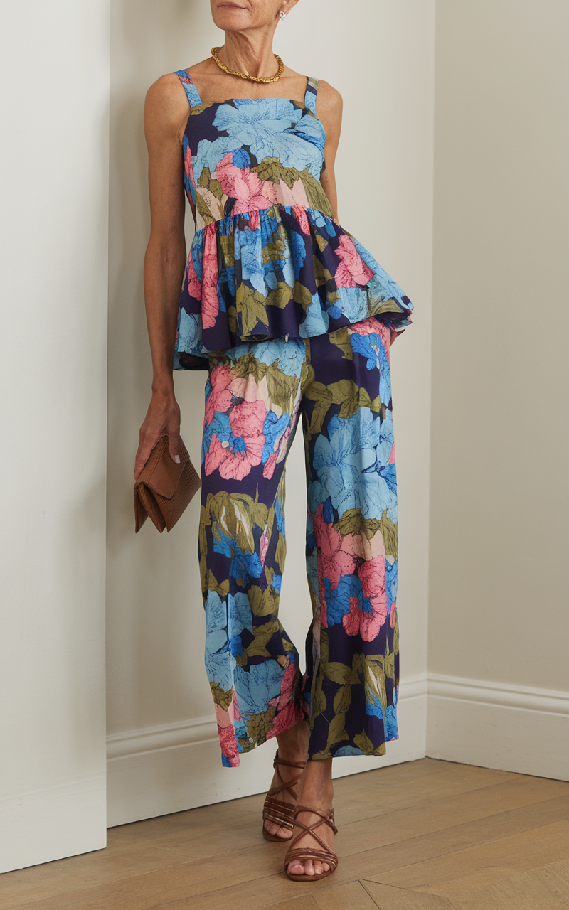 This floral outfit features a sleeveless peplum top and baggy pants with vibrant blue, pink and olive green patterns. The upper layers of this outfit create a dynamic look, while the baggy pants combine style and boho essence. This ensemble blends casual with personality to create looks that work for garden parties as well as city events. This outfit is the perfect conclusion to my 2025 style selection.
