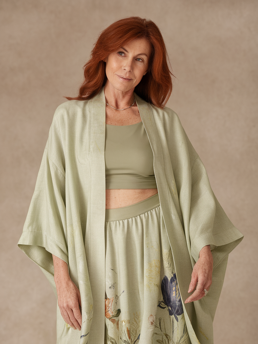 The relaxed fit of this co-ord creates a casual look with its minimal top and comfortable kimono jacket in soft sage green fabric. Additional elements of delicate floral print on the flowing skirt create a soft classic and feminine appeal. The design offers an elegant and fresh look that prevents unflattering moments for people in their style fifty phase. People can easily love this ensemble because it combines traditional relaxation styles with contemporary flavor during the year 2025.