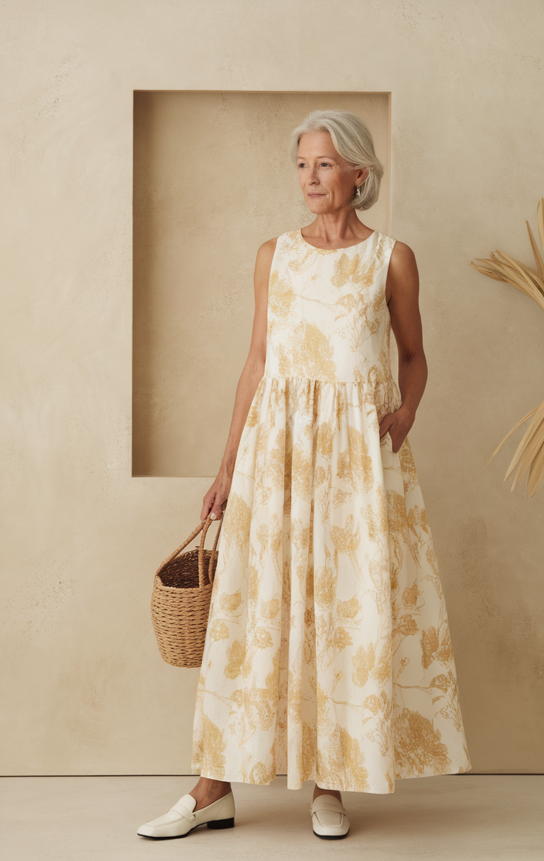 This sleeveless dress is light because it uses soft florals in golden yellow that rest on a creamy ground. A gathering at the hem of the skirt creates a relaxed appeal, but the nude bodice maintains a basic sophistication that flatters all shapes. This wardrobe staple works perfectly as everyday casual wear for Florida beach days as well as preppy destination visits. This summer look for mature women ages 50 to 65 offers both charming style and fashion.
