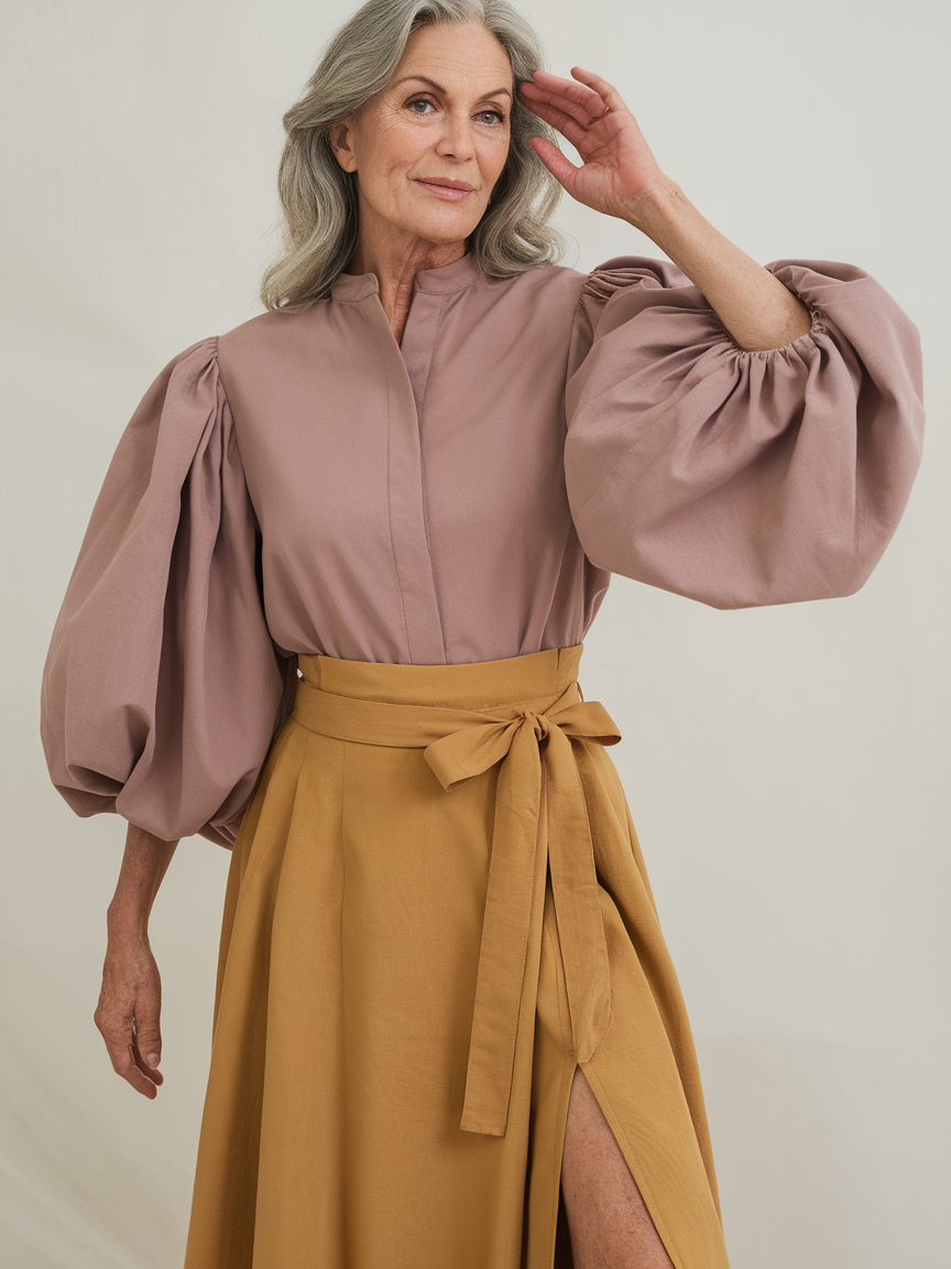 This combination pairs a mauve blouse with large puff sleeves with a mustard wrap skirt that features a high slit and a matching belt. The combination of structured and soft materials in this outfit creates a contemporary aesthetic that works perfectly from lunch to anything between casual and formal. This ensemble represents a sophisticated, modern style that demonstrates that today’s woman can experiment with both color and shape. The outfit provides a sophisticated look suitable for women who want to express their style effectively without thinking too much about their clothes.