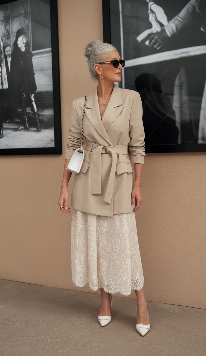 The outfit features a waist-cinching beige blazer with a homemade belt that sits perfectly on a lace midi skirt. The outfit design showcases today’s elegant blend of hard and soft shapes through seamless fusion. The outfit creates an elegant interpretation of dressy casual that works well for urban city visits or leisure lunches. This aesthetic staple is the ultimate choice for 2025 fashion.