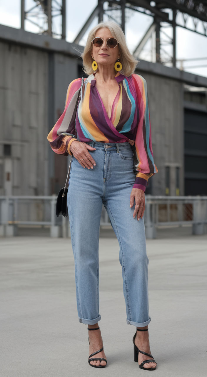The daring striped wrap blouse combines its plunging neckline with flowing sleeves when paired with light-washed high-waisted jeans. When a person shows her midriff and waist in this style, it creates a modern and youthful look that feels trendy and relaxed. This outfit effectively captures the principles of style fifty without creating a frumpy appearance while combining color and confidence. The ensemble is equally at home on a chilly Nashville weekend as it is on a stylish coffee run.