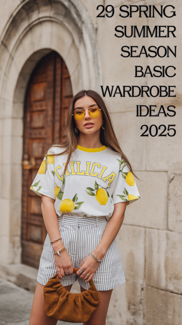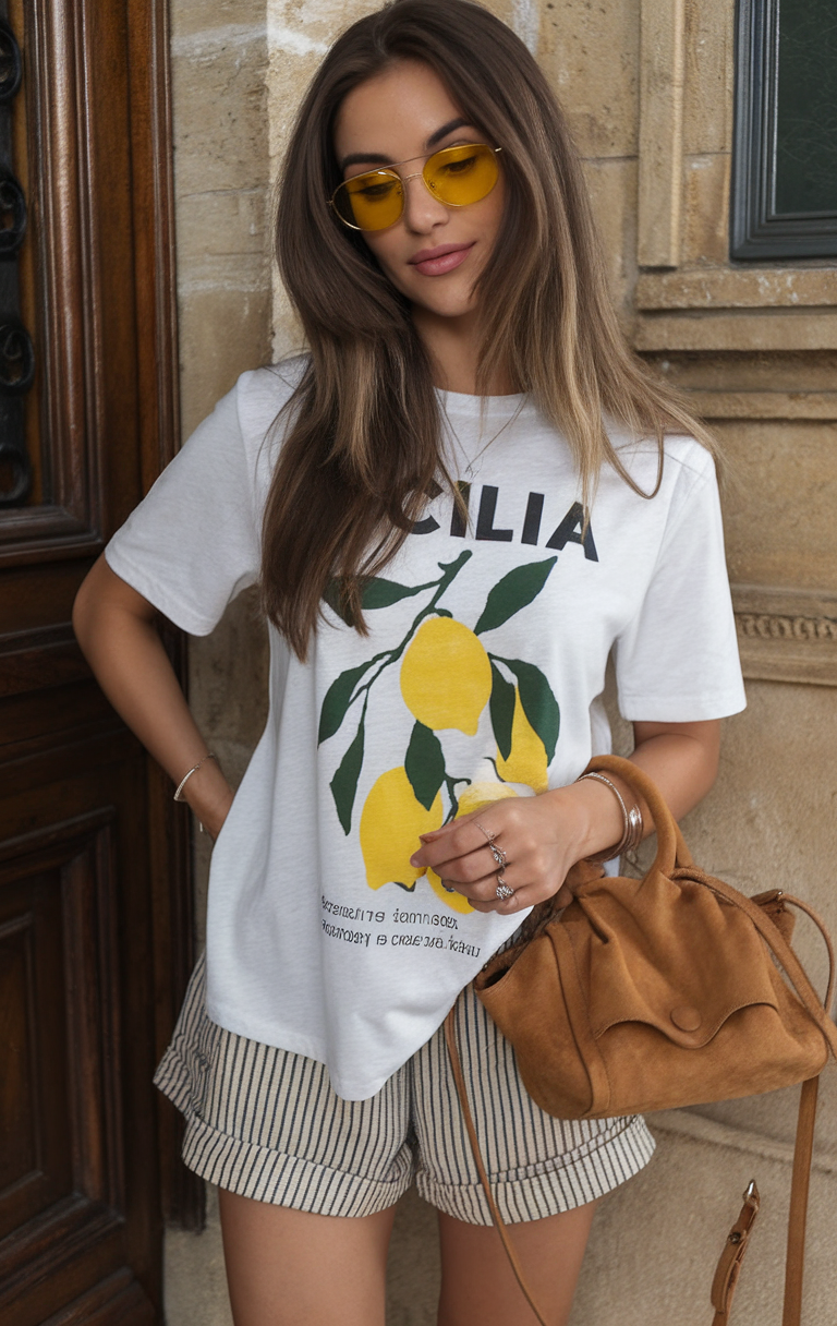 Keeping it casual yet nonchalant with the oversized white tee that features a Sicilian Lemon graphic print. The neutral toned base striped shorts complete the simple yet slightly feminine touch. More compliments can be seen and made with the brown, suede handbag accompanying and completing the outfit. This all becomes great for a minimalist look for those easy styling summer days. So caring this warm, effortless and timeless fit for essentials 2025