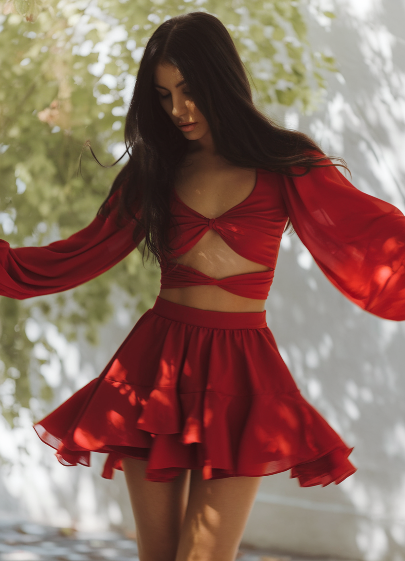 A chic and trendy bold red two-piece set featuring a cropped tie front top with billowy long sleeves matched with a set of layered ruffled mini skirts. Featuring a lightweight fabric, this looks flows easily making it wearable for Spring/Summer 2025. The red color makes it stand out serving as a statement staples 2025 set and to be worn in Ibiza and summer vacations.