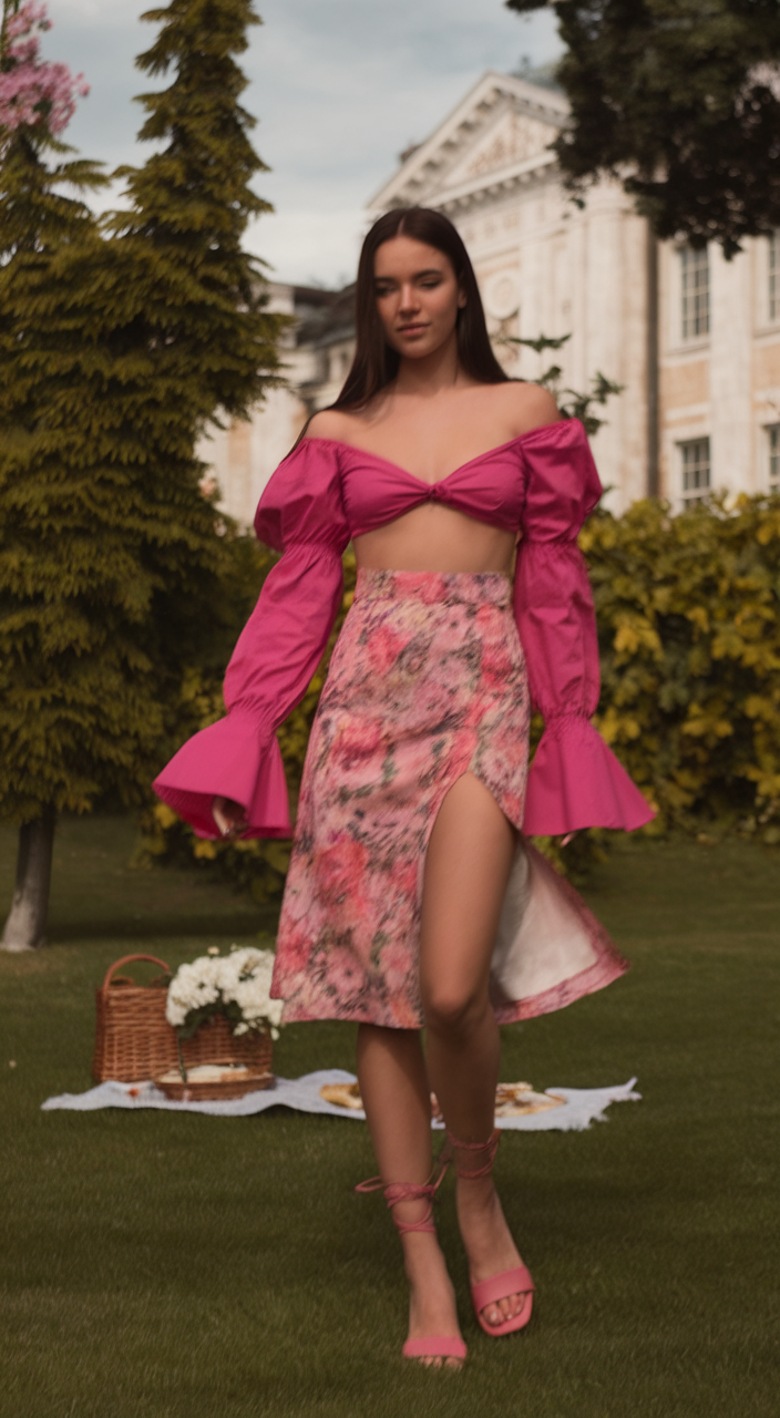 An elegantly off the shoulder top with ballooning sleeves pairs wonderfully with a floral high slit midi skirt making it a chic and clean pair for any occasion. The bright pink shade serves as a refreshing playful accent giving this look a great capsule 2025 piece. Being so detailed and lightweight makes the outfit breathable and functional for hot weather and beautifully finished with lace up sandals gives the able the Italian look.