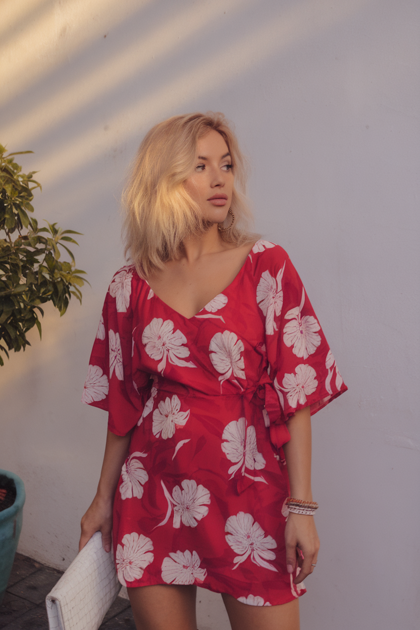 The effortless flowy wrap dress made from lightweight fabric is paired with an underlying red dress featuring large white flowers. Quick kimono sleeves add refreshing spin to the overall effortless vibe, making it perfect for Spring and summer of 2025. While the Italian side tie detail is perfect for giving some shape to the dress, this look is finished off with a woven clutch which remains retainer relevant in 2025.