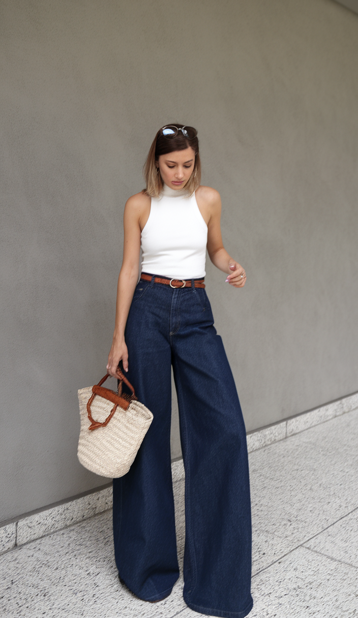 A minimalist rendition to daily styling is showcased with these wide-leg light-wash denim jeans combined with a white sleeveless cropped top. Jeans with a raw-hem detailing are ultra-modern which makes this 2025 staple a must have. A woven tote bag goes with the light and relaxed silhouette ideal for Italian women inspired casual looks. This capsule 2025 outfit looks put together while providing the wearer maximum comfort.