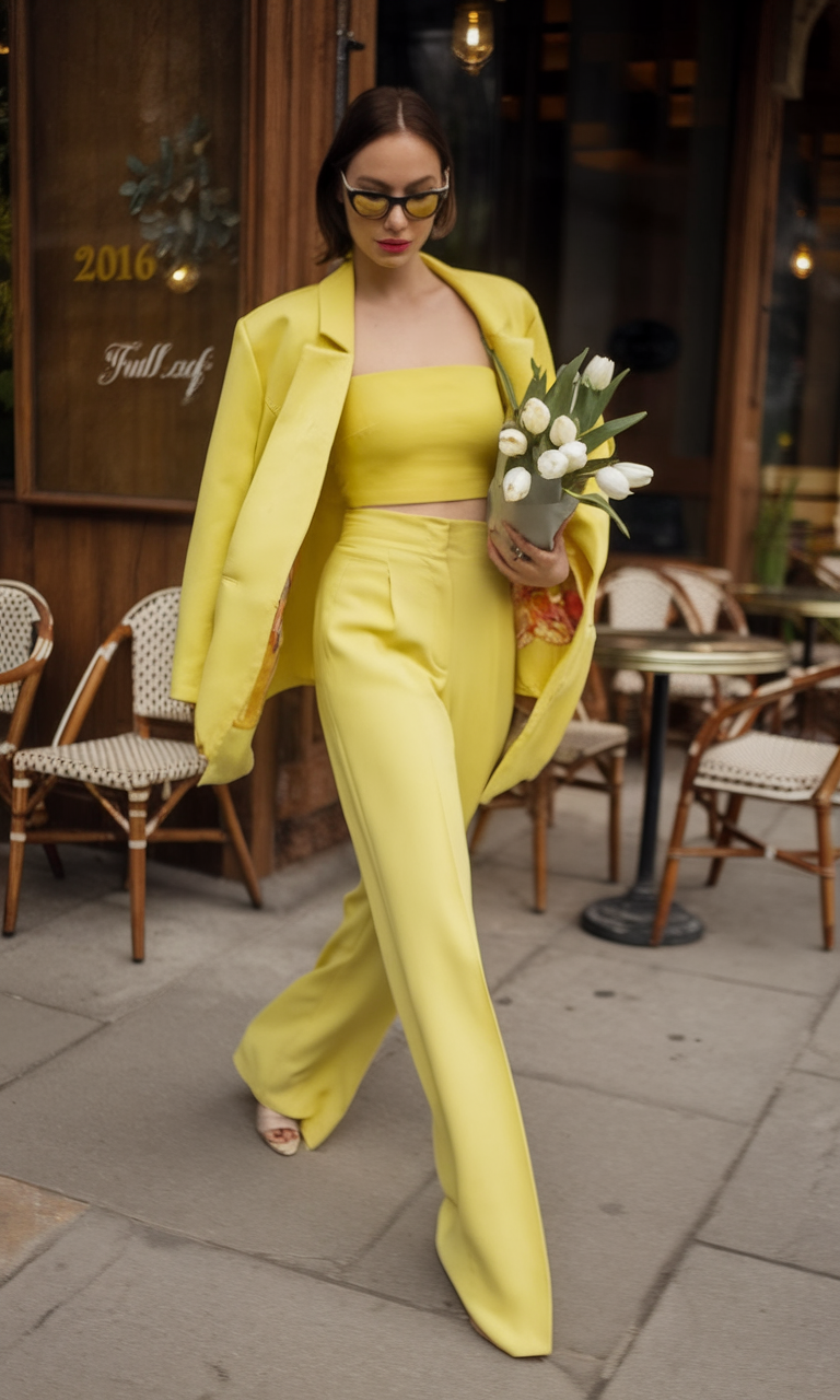 This eye-catching yellow border 2025 suit alongside its custom capsule pack confidently introduces modern femininity. The soft tailored wide-leg trousers elegantly define the figure as the cropped bandeau top retains a playful ambience. Polished off with tonal accessories, the oversized pre-loved Italian women focus in a chic way, put all the minimalist hypes to rest.
