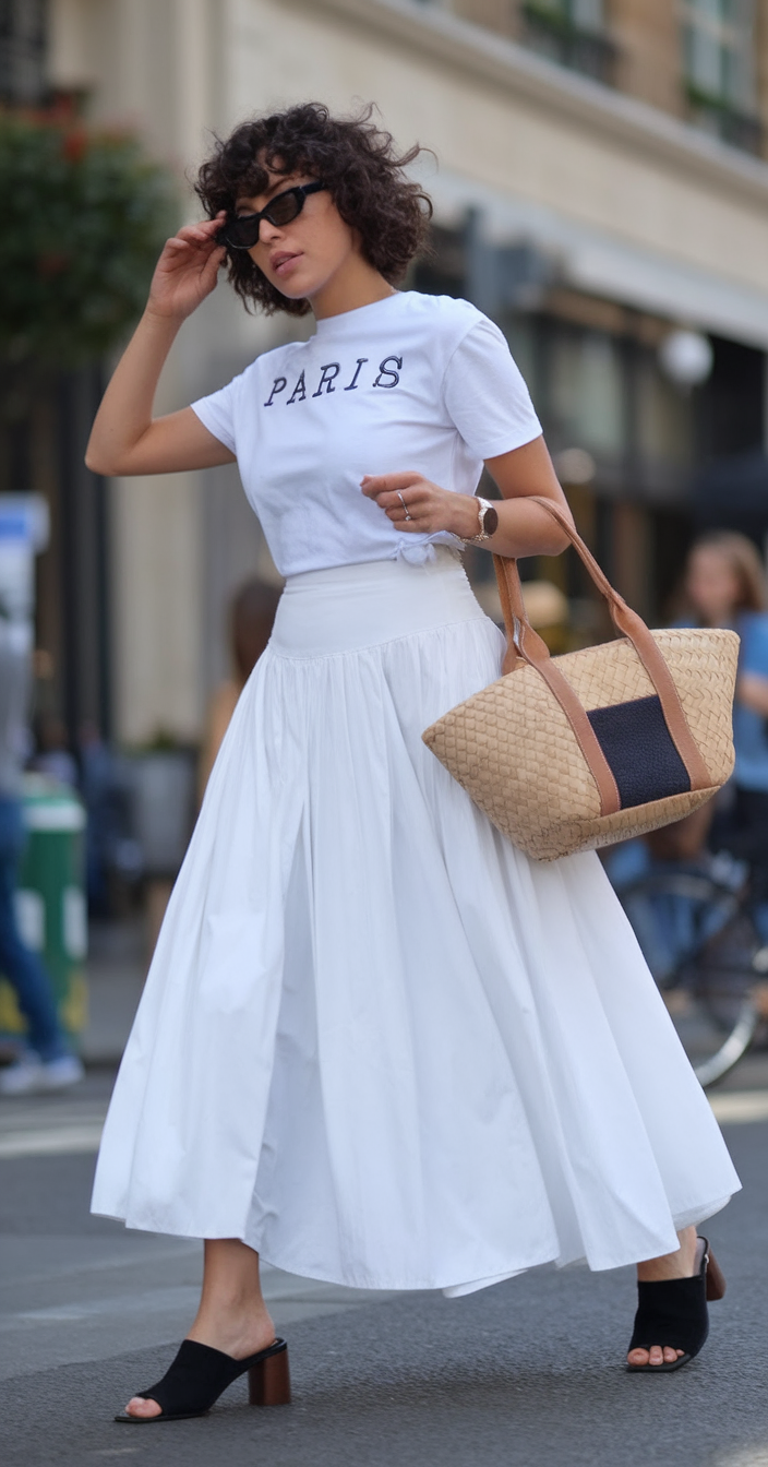This outfit features a crisp white graphic tee paired effortlessly with a voluminous white maxi skirt. The look is elevated with black mule heels and a woven tote bag, giving it a classic yet modern Paris-inspired vibe. Perfect for a day outdoors, this ensemble combines minimalism with a hint of elegance for any casual or teacher-friendly outing.