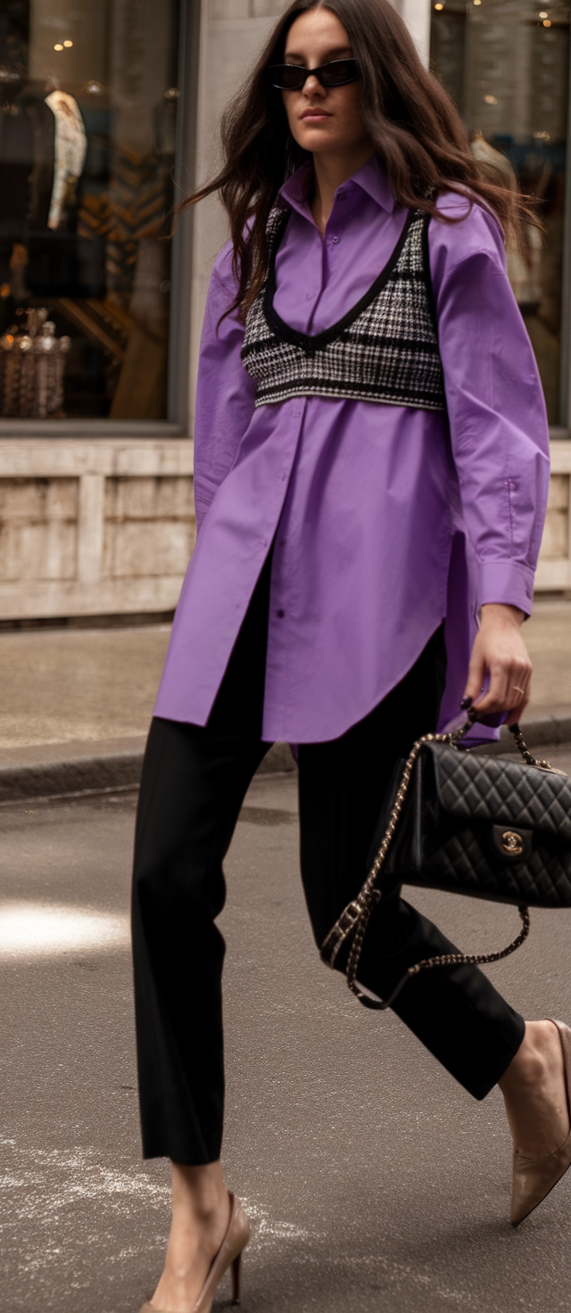 This outfit combines a long, oversized purple button-up shirt with a black-and-white tweed bralette layered on top for a striking street style statement. Black tailored trousers balance the bold upper layers, while nude pointed heels keep the look elegant and versatile. Perfect for work or an inspired modern city ensemble.