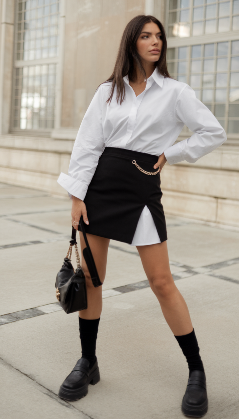 A crisp white shirt tucked into a black high-waisted mini skirt with a side chain accent defines this Paris-inspired look. The skirt’s structured slit detail adds a modern twist, while black loafers with socks give it a preppy edge. A quilted black handbag completes this school-appropriate yet sophisticated outfit.