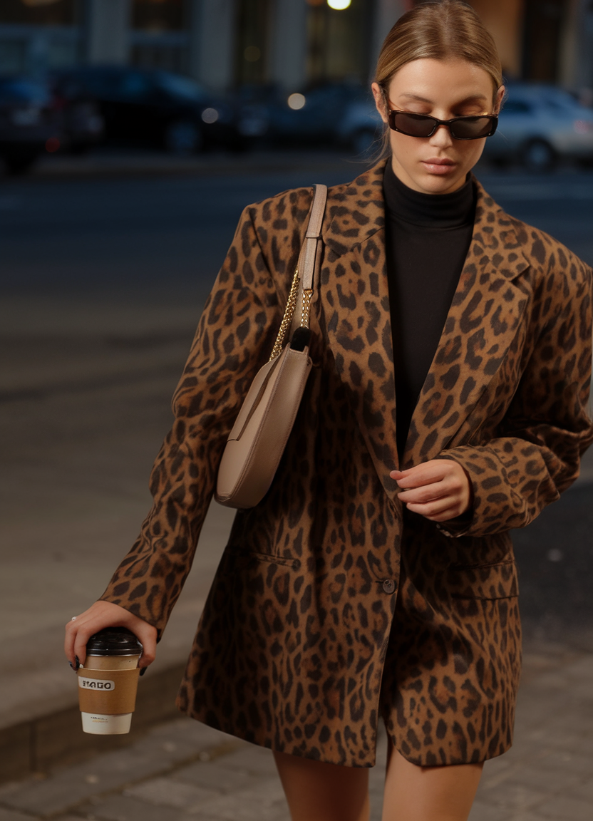 A tailored leopard-print coat makes a bold statement in this chic streetwear outfit. It’s paired with a sleek black turtleneck for a streamlined look, while a tan shoulder bag adds a subtle touch of elegance. Ideal for cold spring mornings, this ensemble combines vintage flair with modern practicality.