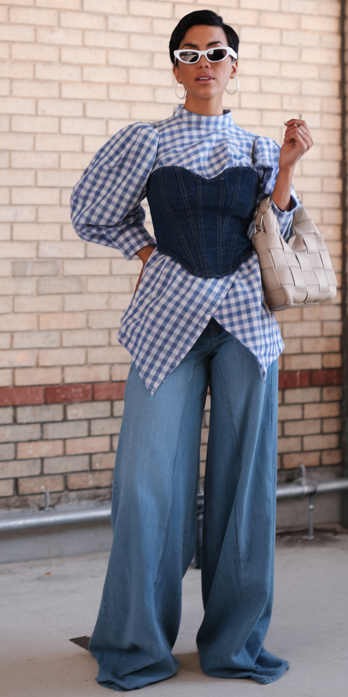 This bold look combines a blue gingham puff-sleeve top layered with a structured denim corset for a dramatic silhouette. Wide-leg denim pants complete the outfit, adding balance and a vintage touch. Paired with white cat-eye sunglasses and a neutral woven handbag, this boho chic ensemble is perfect for spring street style inspiration.