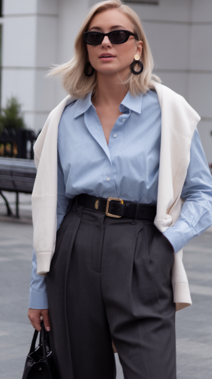 This polished outfit features a crisp blue button-down shirt paired with high-waisted dark gray pleated trousers. A black leather belt with a gold buckle adds definition to the waist, while a draped white sweater provides a relaxed, layered touch. Bold black sunglasses and statement earrings complete this age-appropriate look for work or outdoor events.