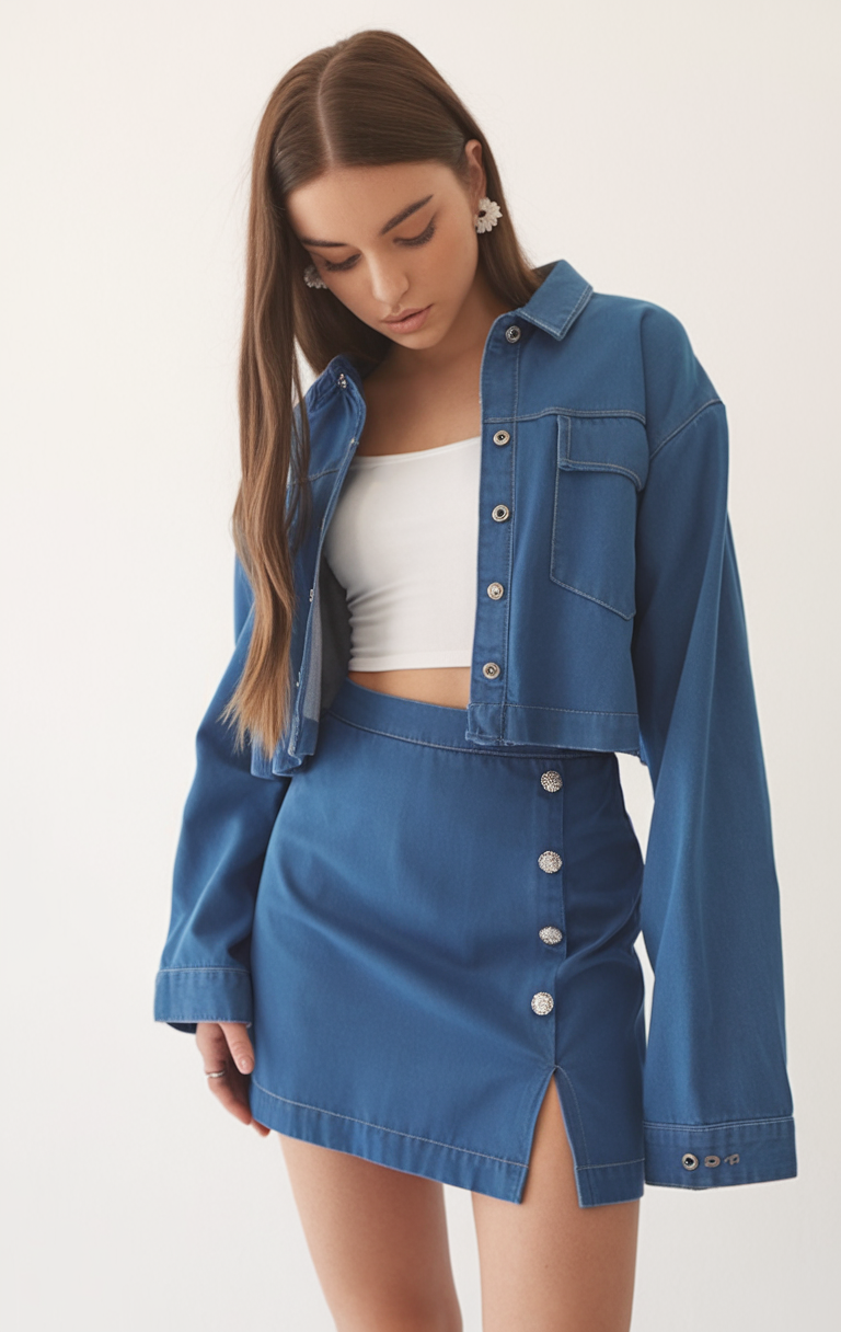 This co-ord set includes a cropped blue denim jacket with button details, paired with a matching high-waisted mini skirt. The skirt’s side slit and silver button accents add a contemporary edge, while a white cropped tank top underneath keeps the ensemble fresh. Perfect for a casual spring day or school-inspired styling.