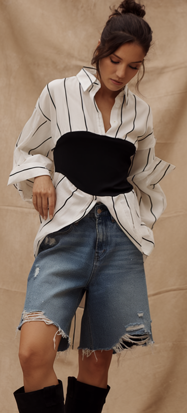 This outfit blends a black-and-white striped oversized button-up shirt with distressed denim Bermuda shorts for a relaxed yet edgy vibe. A structured black corset cinches the waist, creating a contrast of tailored and casual elements. Black knee-high boots complete this vintage-inspired ensemble, ideal for street style lovers.