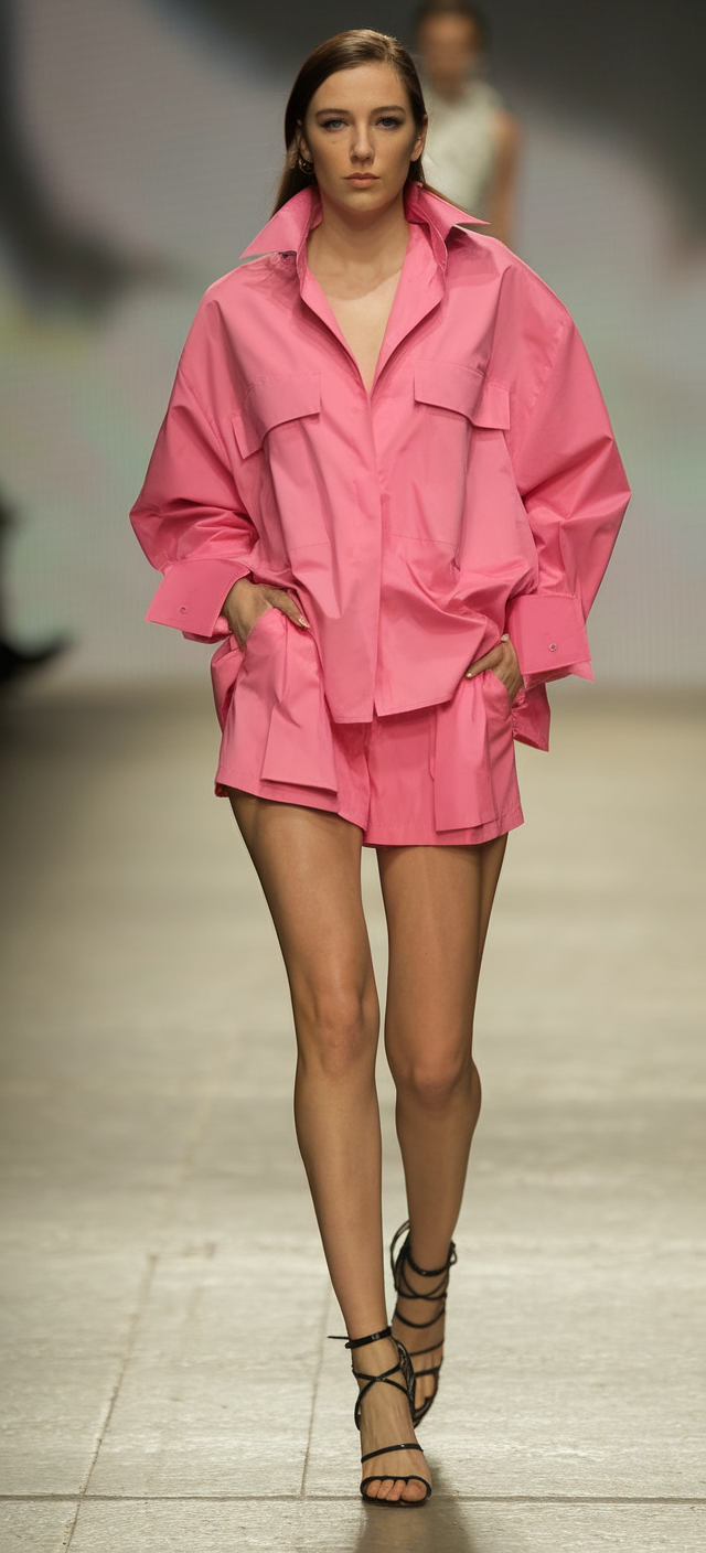 A vibrant pink oversized shirt paired with matching tailored shorts makes a bold statement in street styles for spring. Strappy black heels add a sophisticated touch to this head-turning ensemble. This look is both age-appropriate and inspired by the confident edge of runway fashion, making it a great choice for work breaks or casual events.