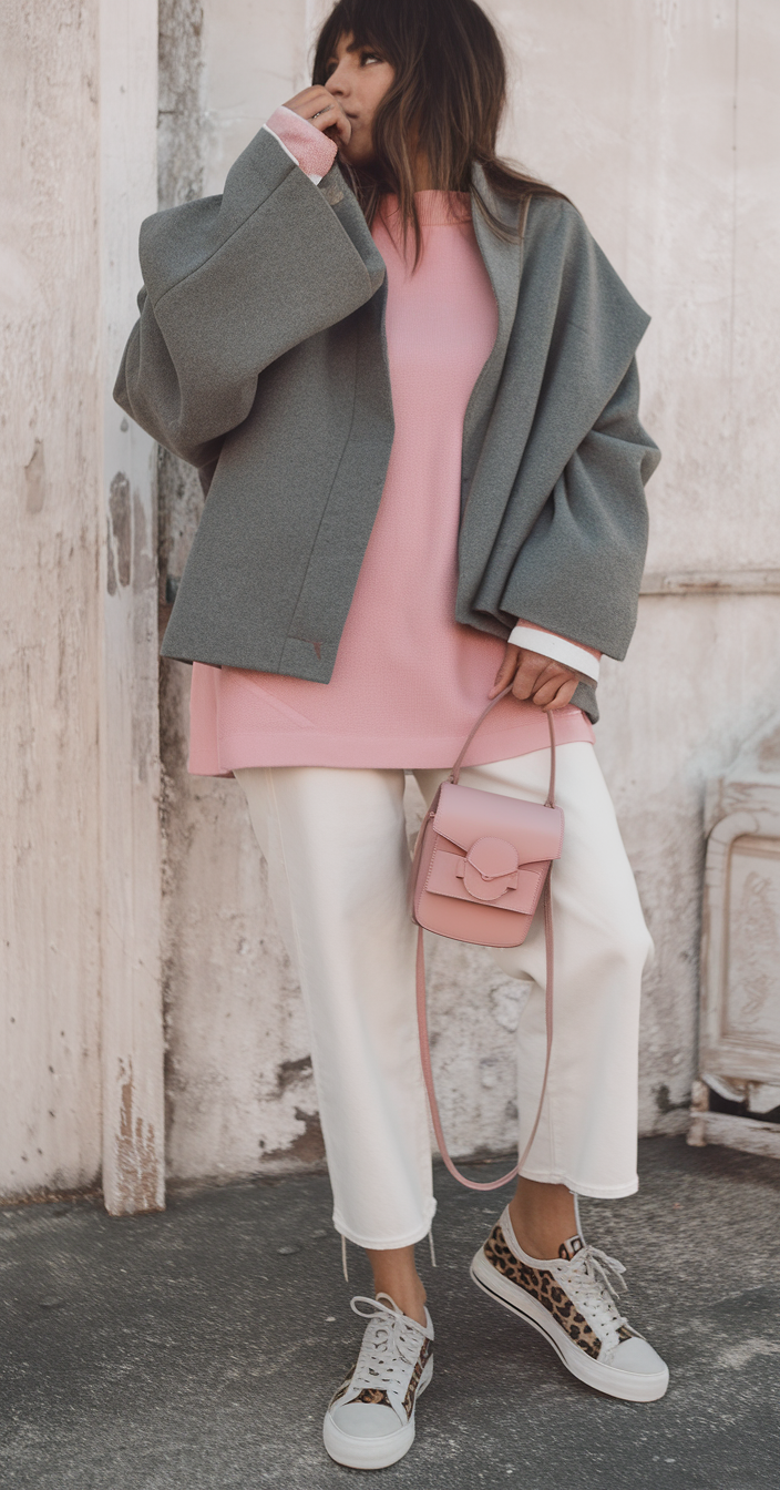 This casual-chic combination features an oversized gray coat layered over a soft pink tunic top, exuding cozy vibes perfect for transitional weather. The white straight-leg trousers keep the look fresh and clean, adding a modern touch. Accents like a tiny pink crossbody bag and leopard-print sneakers add personality and playfulness, making this an ideal everyday spring outfit inspiration 2025 for laid-back street style.