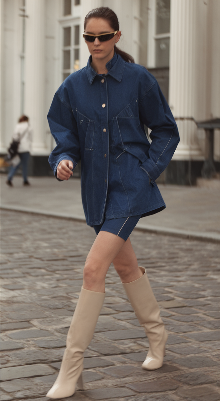 A structured dark denim jacket with prominent stitching details and flap pockets, styled as a mini dress. The look is completed with matching dark denim shorts underneath, giving a seamless, tonal effect. Neutral knee-high boots add a sleek and modern contrast.