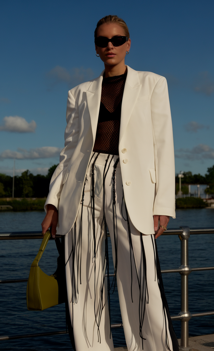A bold white tailored blazer with clean lapels paired with wide-leg trousers featuring black fringe detailing down the sides. The inner layer is a black fishnet top that adds an edgy contrast, styled with a lime green structured handbag for a pop of color.