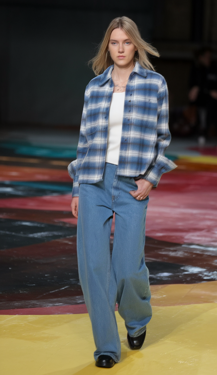 This outfit combines a soft blue plaid button-up shirt layered over a simple white tank top, paired with wide-leg denim jeans. The casual yet polished vibe is perfect for a relaxed outdoor day or a school setting. Black leather shoes complete the ensemble, offering both style and practicality for the season.
