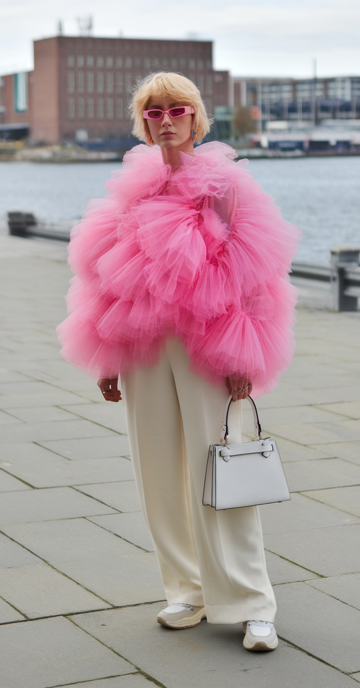 A dramatic layered pink tulle top takes center stage, paired with flowing white tailored trousers for an effortlessly chic balance. The addition of trendy pink sunglasses and a structured white handbag adds modern sophistication. This heartstopper outfit is ideal for a wedding guest or a standout street style moment.