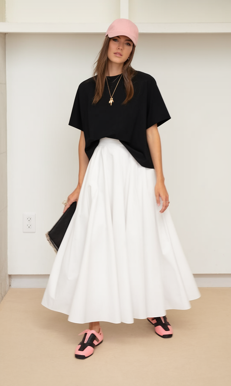 This outfit features a loose black oversized T-shirt tucked into a voluminous white maxi skirt, creating a monochromatic yet boho chic look. Bright pink sneakers with black detailing and a light pink cap add a playful touch, making it suitable for casual streetwear men-inspired styling or a relaxed work day. Gold layered necklaces finish the outfit with a hint of elegance.