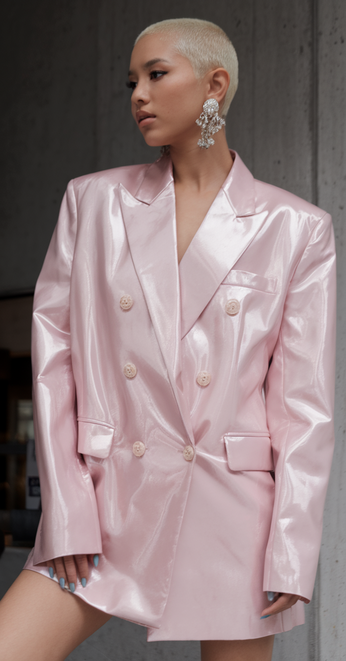 This sleek outfit features a glossy pastel pink oversized blazer, worn as a mini dress for a modern heartstopper look. The structured double-breasted design and subtle button detailing create a sophisticated silhouette. Paired with dazzling crystal drop earrings, this outfit is perfect for an inspired evening or a trendy wedding guest appearance.