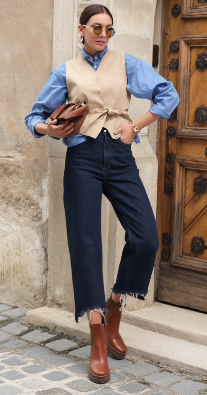 This outfit showcases a tailored beige vest layered over a classic blue button-up shirt, paired with dark high-waisted denim jeans. The raw-hem cropped jeans bring a street style edge, while brown leather boots add a touch of vintage charm. This versatile look is great for a teacher-friendly outfit or a polished work day.