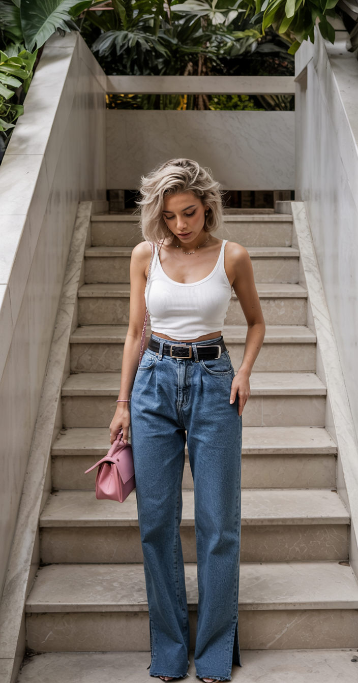 This outfit blends a tailored drop-seat crop tank top with high-waisted casual jeans for a strong, fitted ensemble. The straight leg design along with the slit detail of the jeans provides a soft, stylish touch that is appropriate for the casual summer dressing of Fashion 2025. The wide black belt and soft pink handbag keep the relaxed look in balance, making it suitable for everyday city wear. The outfit delivers an outstanding look that suits people who are looking for both ease of wear and Korean-inspired midsize street fashion through clothes that automatically create a confident appearance.