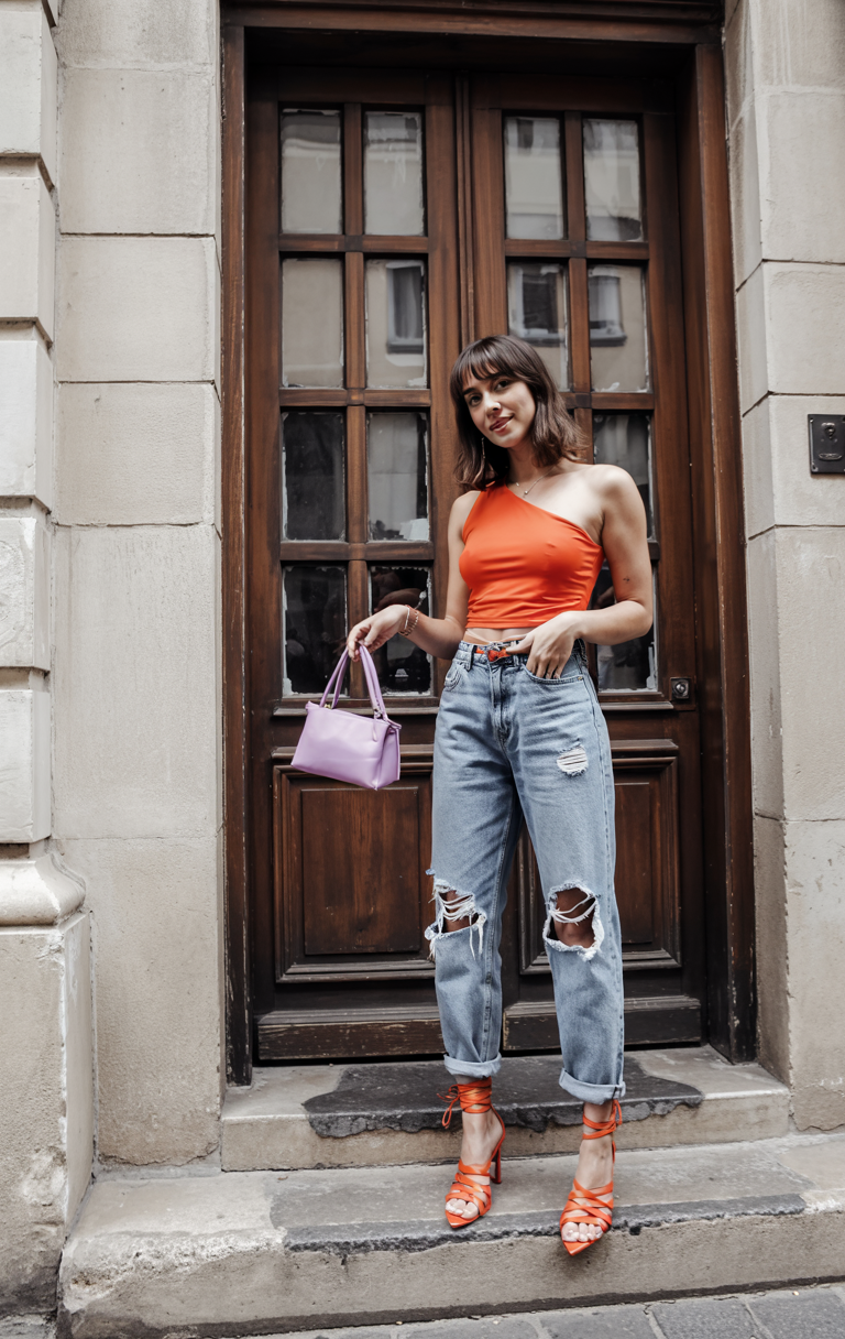 Few women have the courage to wear this bold casual ensemble, which combines distressed cuffed casual jeans with an asymmetrical one-shoulder orange crop top. The combination of a sleeveless shirt with small slits and loose, baggy jeans works because the flat top accentuates the wrapped shape of the jeans. Yellow heels with purple mini purses complete the color blocking fashion trend for 2025. The combination of daring and youthful elements shows Korean fashion elements suitable for mid-sized individuals who follow 2025 fashion trends during summer days.